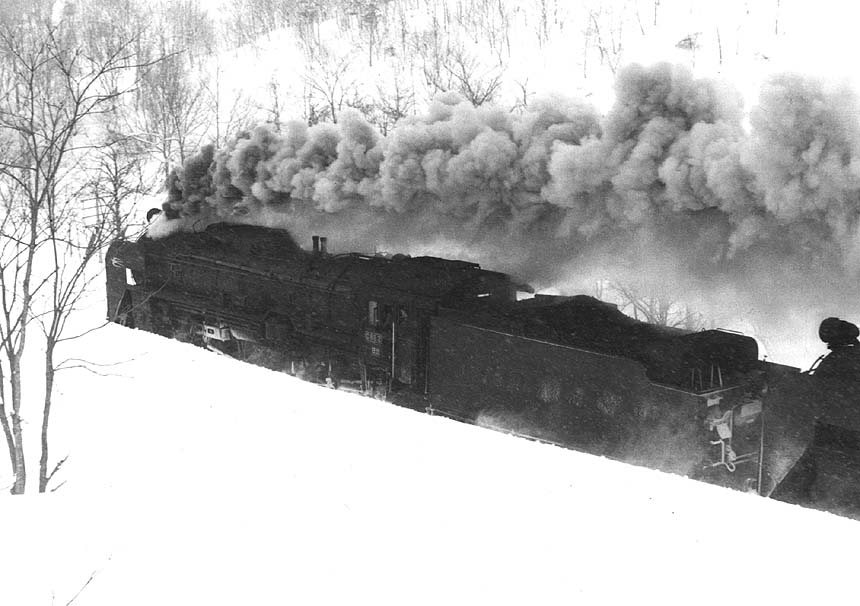 上目名を目指して突進する急行「ニセコ1号」104レ。あまりにも速いスピードのため、爆煙が真横にたなびいていた。