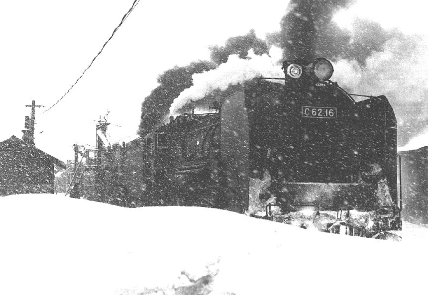 長万部駅に到着した上り急行「ニセコ1号」104レ。補機のC62 16はここで切り離され、夕刻の下り103レまで機関区で待機する。