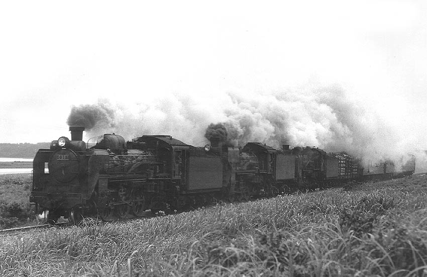 お祭り三銃士、北辺のC58三重連 (1971/7 釧網本線 北浜) 確かこの年は国鉄100周年だったと思います。第一次SLブーム盛り上がりもあって、各地で特別列車が運転されました。 北海道でも、C62x3、C55x2、9600x2、そして釧網本線ではC58x3が運行されました。 先頭はC58 1、次位は後藤デフ装備385号機+C58+混合列車、実にファニイな井手達でした。 次へ 前へ 表紙(掲示板リンク)へ戻る