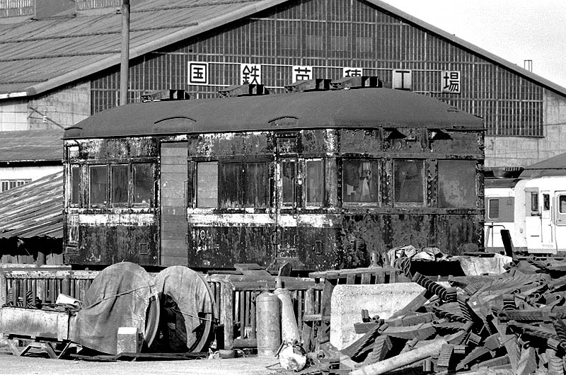 物置?路面電車?あっ!キハニ5000だ!!(1971苗穂工場) 31年前のある日、苗穂機関区あたりをブラブラしていたら奇妙な車両を見つけました。 深い屋根、リベットだらけの車体、特徴ある窓配置・・紛れも無く1929年に造られたキハニ5000のなれの果てでした。 名著「陸蒸気からひかりまで」のイラストで見た幻のキハとの遭遇でした。(現在は復元され苗穂工場で保存されています。)