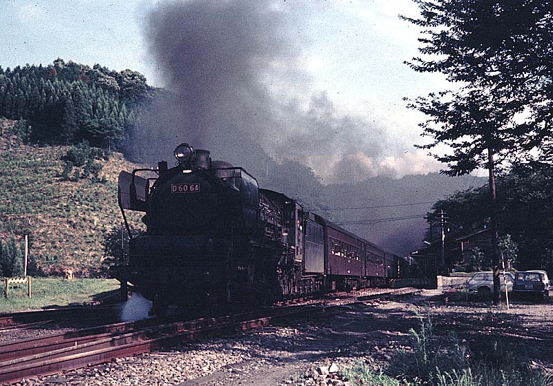 久大本線夜明駅を発車するD60 64 638レ旅客列車。大分と久留米を結ぶ久大本線は由布院の水分峠越え に備えるため、当初のC58型をD60型に置き換えた経歴を持つ。 夜明駅から日田彦山線が分岐し、C11の 旅客列車が日田まで乗り入れていた。 前へ 次へ 最初のページに戻る