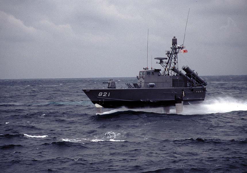 ミサイル艇1号 古臭い漁船じみた外観から想像もつかない90km/h以上の高速とモーターボート並の機動性を発揮する。