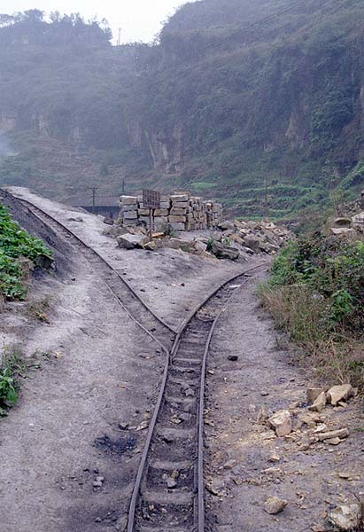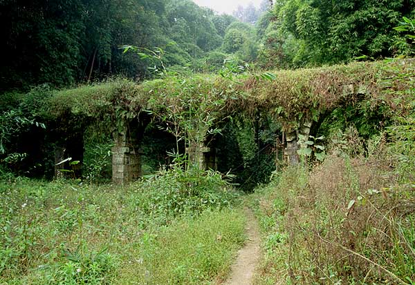 スイッチバック駅の蜜蜂岩から芭溝駅にかけて、かつては無数の炭鉱が存在し、専用線が敷設されていた。これはその一つ、焦県〜仙人脚に残る廃線跡だが、非常に古く1890年代に建設された石橋だそうである。同年代に建設された信越本線碓氷峠のアーチ橋に共通した構造である。