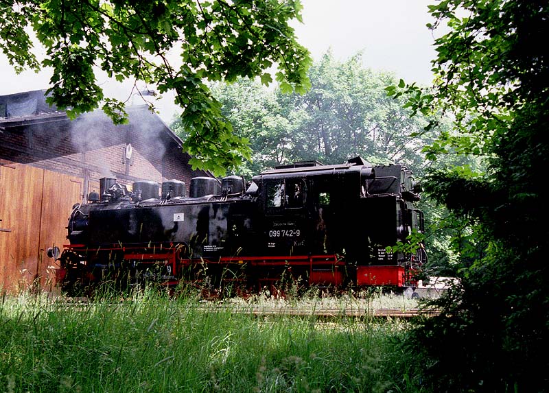 ドイツ南東部の古都ドレスデン市から近郊線で20分も掛からない所に全列車がSLで運行される750mm軌道の ナローゲージが2本もある。これは市の北方のラーデボイル(Radebeul)線。動輪5つの99‐700型が働いていた。 前へ 次へ 目次へ戻る