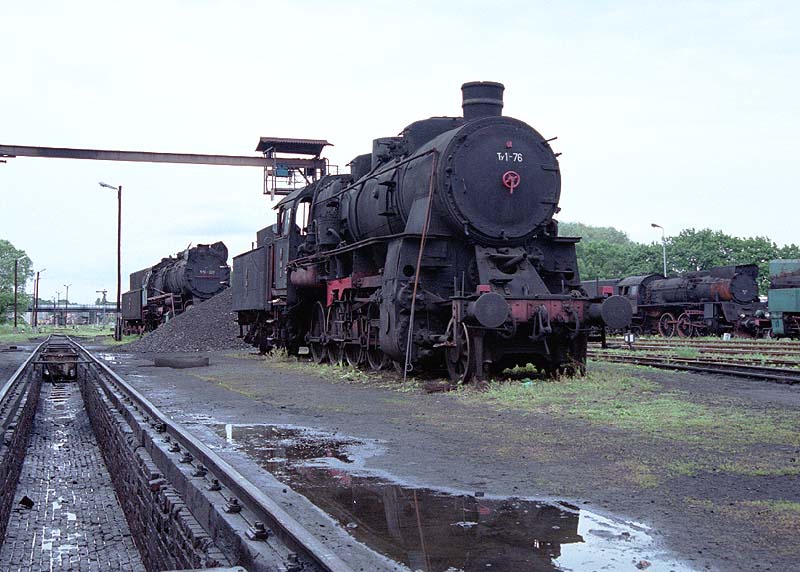 構内に目を転じると、もはや動くことの出来なくなった蒸気機関車が何両も放置されていた。 画面中央のTy1型は、5つの動輪を持つ旧ドイツ国鉄のDR58である。右にはOL49型、後方にTy51が留置 されている。 戻る 次へ 最初のページへ
