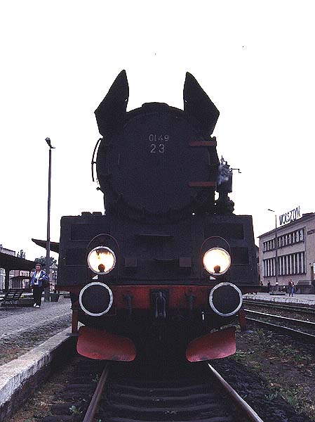 正面からみたOL49−23号機。ロバの耳のような形のデフレクターと、2つの大きな全照燈が近代型ポーランドSLの特徴である。