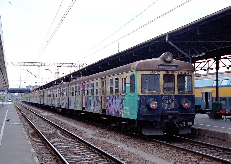 ポーランドの近郊型電車、全面上部のEN57が形式だろうか。ポズナン付近で見た車両はどれも落書きだらけだった。