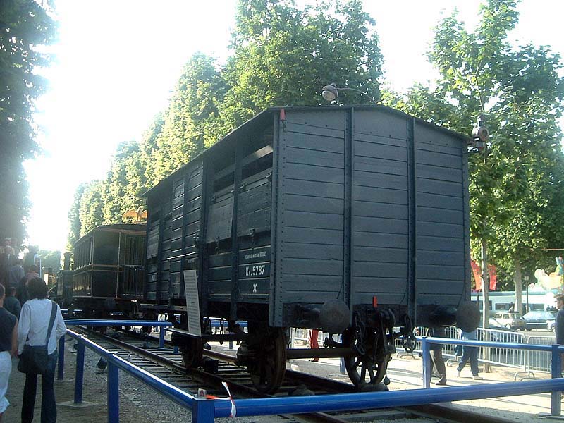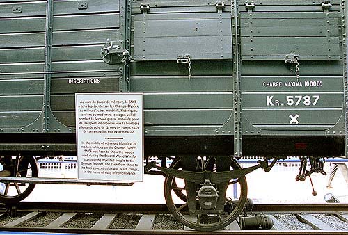 ”新旧の車両とともにシャンゼリゼに展示されているこの貨車は、第二次世界大戦の時に最前線に人間を送り、そしてナチスの絶滅収容所に人間を運んだ車両です。フランス国鉄はその記憶を