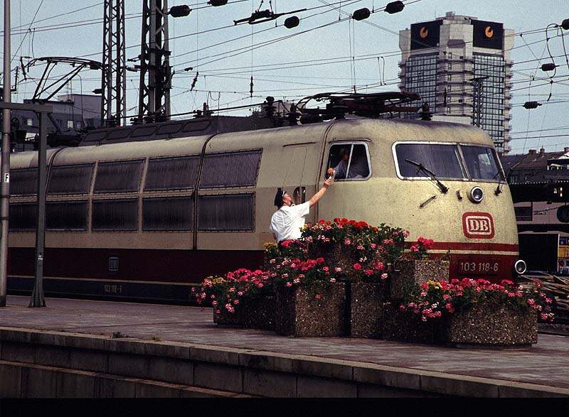 フランクフルト中央駅で発車を待つ103−118号機。(1992/05) フランクフルト駅は通り抜けの無い堂々たるターミナル式の線路配置である。到着したEC特急列車は機関車を出発方向に 付け替えていたが、現在はそのまま推進運転で運行されるようになり、機関車の付け替え風景は過去の物となった。 E103の部屋に戻る