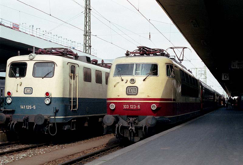 103−123号機と141−125号機(ニュルンベルク 1991.5.25) 1991年は280km/hの高速で走るICE(インターシティエクスプレス)が初めて登場した年で、西ドイツ全土を結ぶ IC(インターシティ)特急列車の最後の活躍の年となった。IC(EC)はその後次々とICEに置換えられ、 103型は次第に活躍の場を狭められていった。 E103の部屋に戻る