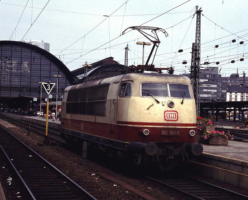 103−185号機 フランクフルト中央駅(Frankfurt Hbf)にて。1992.05 ドイツ国有鉄道(Deutsche Bundesbahn)時代のオリジナル塗装。185号機は、1970年〜74年に145両製造された 第一次量産機に属し、ショートキャブの車体を備えている。 E103の部屋に戻る