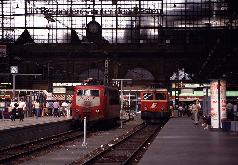フランクフルト中央駅で休む103−231号機とオーストリア国鉄(OBB)1044−36号機。(1992/05) 103−231はE103型の最終生産30両に属し、1次型より70cm長い車体を備え出力7,780kwに強化された。 OBB1044型は軸配置B−B、オーストリアの代表的なELである。 E103の部屋に戻る