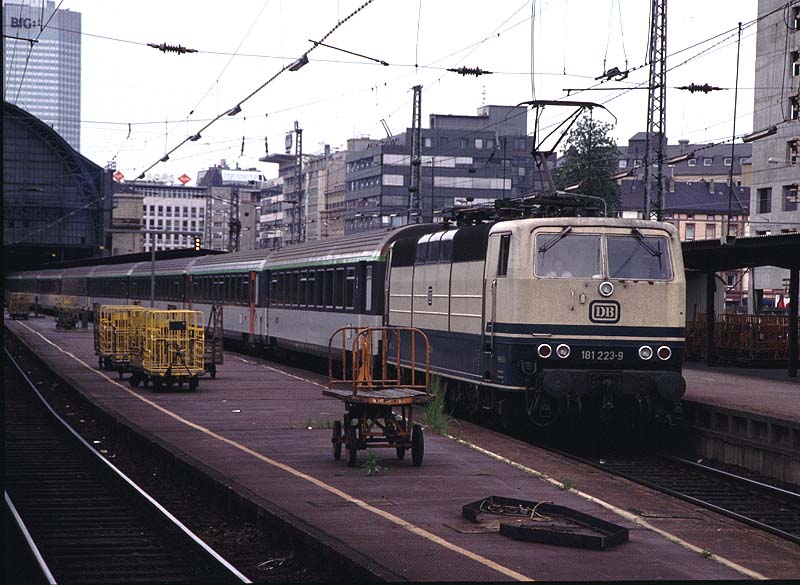 可変電圧用181型EL。軸配置C+C (1992/5 フランクフルト) ドイツ国内から、電圧と周波数が異なるフランス及びルクセンブルグへの直通用として、1974/75年に25両が製造された。 写真は、フランクフルト中央駅を出発するフランス国鉄(SNCF)の特急列車。 戻る