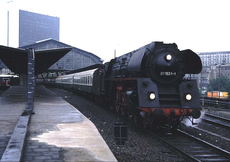 2つ先の駅で追いつき、駆け寄ってみるとなんと旧東ドイツ国鉄(DR)の大型旅客用テンダー01−5型だった。 驚いた事にこの列車は特別列車ではなく、通常のポツダム行きD-Zug(快速)であった。 前へ 次へ 「SLの部屋」に戻る