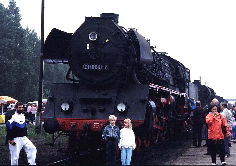 ドイツ各地では頻繁にSLフェアが開催され沢山の人々で賑わう。全国の自慢の保存機が会場で披露され、その量とバラエティーが凄い。 見物客とSLの距離がとても近いのも羨ましい。このフェアは、1993年5月ポツダム市開都1000周年を祝って催されたものである。 前へ(DR89) 次へ 「SLの部屋」に戻る