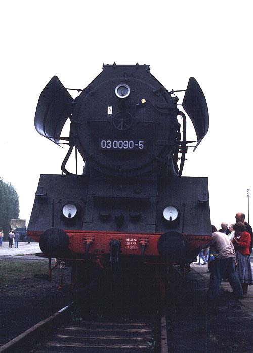 急行客車用03-10型 030090−5号機。1940年クラウス−マッファイ社製。 軸配置2C1,3気筒、総重量178t、出力1,900馬力,最高速度140km 1970年まで旧東ドイツ国鉄(DR)に在籍し亜幹線で活躍した。1993年に復元されウッケルタール鉄道同好会(ドイツ北東部Pasewalk市) 所有となり現在に至る。 前へ 次へ 「SLの部屋」に戻る
