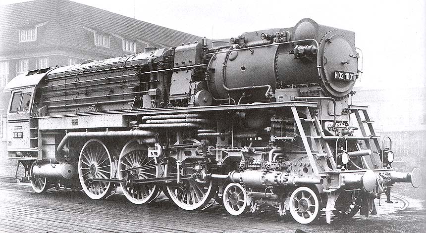 本物の怪物機関車 骸骨のようなボイラー、剥き出しのパイピング、未完成のシリンダー・・・実はこれで走行可能な完成品なのである。 H02 1001号機は蒸気圧120kg/cm2という高圧蒸気の試験用に、1929年にシュワルツコップ(Schwartzkopff)社で製造された試作機だった。良く見ると、ボルトだらけのシリンダーがちゃんとついている。しかも3気筒である。高圧の方が熱エネルギー効率が良くなると言う理論を極めるとこのような姿になる。 戻る
