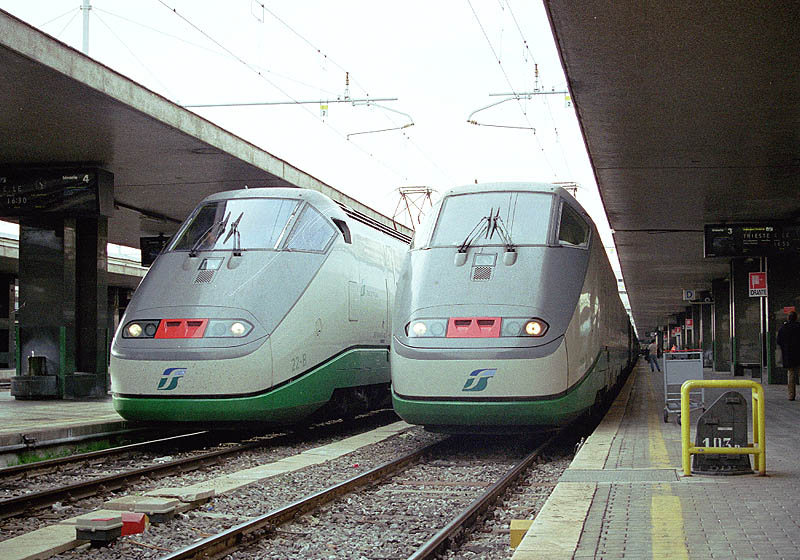 新E3系「つばさ」!? いいえ、これがイタリア技術の粋を結集して創り上げた高速車両ETR500系。 前後に強力な91型ELのAユニットとBユニットを置き、1等車3両、レストラン1両、2等車7両の客車を 組み込んだ13両編成。最高速度は300km/hに設定され、高速専用区間でその実力を発揮する。 次へ 前へ 表紙(掲示板リンク)