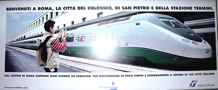 イタリア国鉄提供のポスター。 最新型ETR500の写真を撮る若者。イタリアにも「鉄人」がいるんですねえ。 あれ? この青年は・・・(人間をClick!!) |
