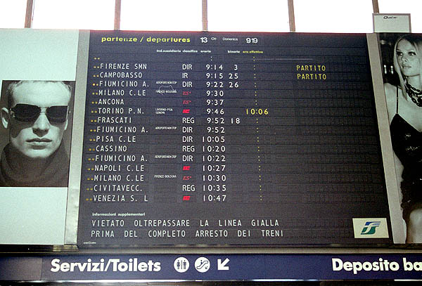 ムッソリーニにより命じられ、1950年に完成したイタリア最大の終着駅。 27番線まであるホームに イタリア全土からの列車が次々に滑り込む、「鉄」の夢の駅である。 モダンな姿は50年以上も前の建築とは思えない。イタリア恐るべし。 コンコースにはずらりと切符窓口が並ぶが、いつも長蛇の人の列。 どうやら駅員と乗客がじっくりと話しこんでいるらしい。ファーストフードではないロウフードの国。 イタリア恐るべし!! |
