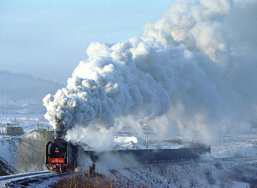 猛然と煙を吹き上げて石炭列車が築堤を駆け上がる。軌道の中を村人が歩いていた。前進型が狂ったように警笛を 鳴らしたが全く動じる様子も無く、ギリギリになってやっと汽車に道を譲った。(2002.1.26)