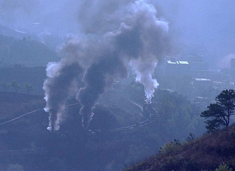 朝日の輝きが増してきた頃、次の列車が現れた。遠くのカーブに三条の煙が立ち昇った。