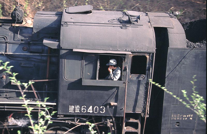 眼前を通過する建設型6403号機。屋根の上のラッパは中国全土共通の機関車タイフォンである。