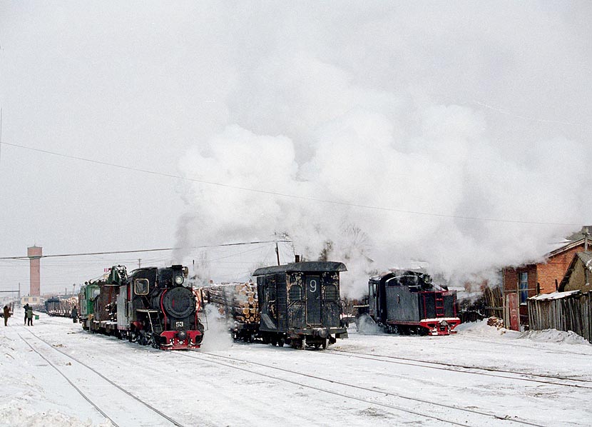 それは夢のような光景だった。中国東北部では珍しい新雪の朝、それほど広くない構内に小さなSLと 丸太を満載した運材車がひしめいていた。そして762mmの細い軌道、見ることの無かった 50年前の木曾森林鉄道はこの様だったのだろうか。 葦河駅の構内 2002/01/23