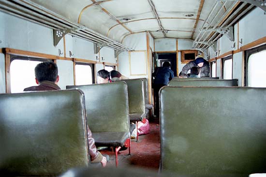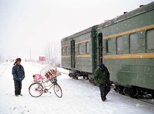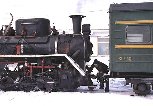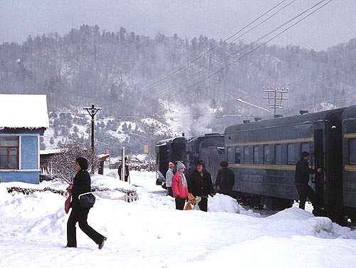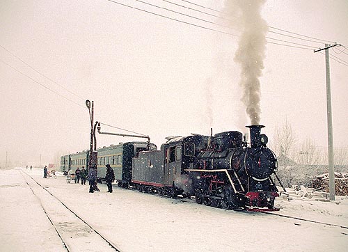 ![]() 平林駅に到着した201レ 列車は途中駅で何回も給水を行い、その度に10分から15分間も停車した。 「春のダイヤ改正で7分間短縮!」とはかけ離れた世界であった。 ![]() 平林駅の山査子(さんざし)売り サンザシは小さなリンゴに似た木の実で、長いくしに刺して飴をからめた 菓子は満州の冬の名物だそうだ。60年前に満蒙開拓団に加わった私の 叔父から聞いた話である。 一串の値段は約3円だった。60年前の菓子の味は、甘酸っぱかった。 ![]() 森林鉄道の客車 762mmゲージと言えども中国の標準仕様客車で、かつては全土で見られ たが、ナローゲージが急速に廃止されている現在では貴重品であろう。 丁度日本の都市バスくらいの車体に小さなクロスシートが並び、窓は厳寒地 らしく二重窓、客車ごとに暖房用ボイラーがあって荷物棚の上にスチームパイプ が通っていた。壊れたのか盗まれたのか、天井には一つも電球が無かった。 |