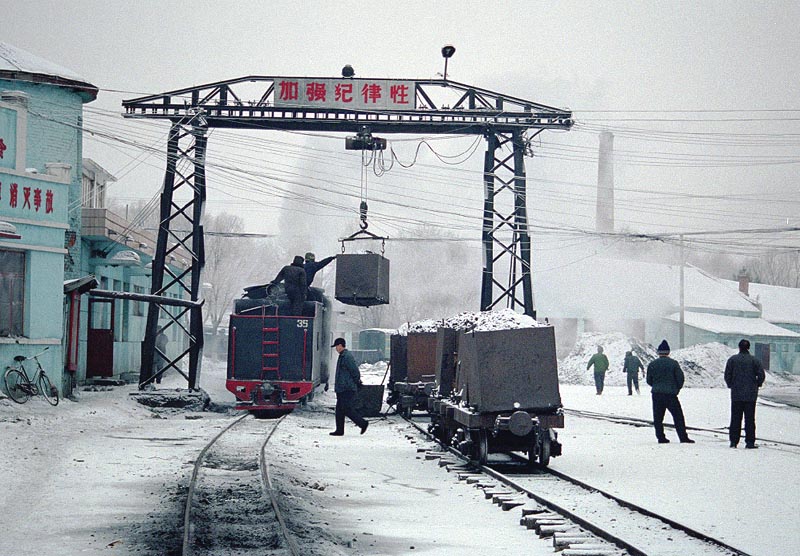 客運駅の機務段(機関区)で給炭する35号機。バケットを使って給炭する作業を旧東ドイツの軽便鉄道と ポーランドで見たが、そっくりであった。共産圏の鉄道に共通な作業手順なのであろうか。 2002/02/21