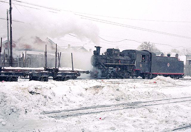 山に向かう空のログカー編成を仕立てるC2型 (2003/2/11 葦河) |