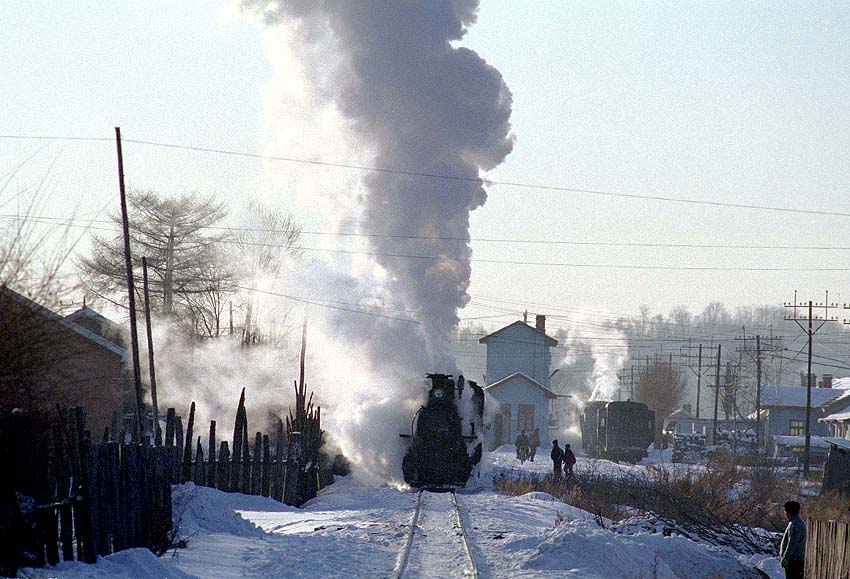 東風駅で木材を満載した運材列車と交換した。先頭に立つC2型は小さな機体を震わせて発車していった。 山間の双峰駅を除くと、葦河森林鉄道は意外に村に近い所を走っていました。林業に従事する 人の村なのでしょう。小さな鉄道と人々の暮しがとても近くに有ったように思います。 次へ 前へ 葦河表紙(掲示板リンク) (2003/2/11 東風)