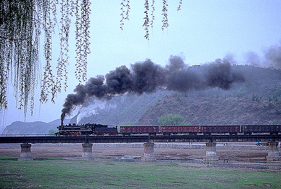 |  承徳市内、武烈河を渡る西行き貨物列車。牽引機は上游型。 |