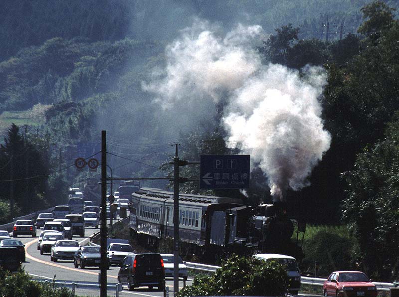 あそBoyの走る沿線は凄く山深いかと想像していたが、街の中や国道に沿って走るところが多く拍子抜けした。それでも58654は国道57号線の横をマイペースで走った。すれ違う車から沢山応援の手が振られていた。(立野〜赤水 2000/11/18) 次へ