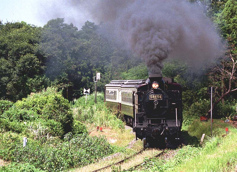 まるで熱帯林のような木立をぬけて、阿蘇山を目指してあそBoyが走る。(肥後大津ー瀬田)