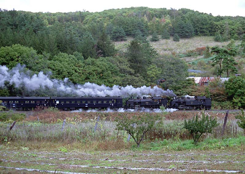 上りニセコは重連であることが良くわかるショットが欲しかったので、側面から狙える場所を捜した。小沢のセトセ丘でも狙ったが、突然の土砂降りでタイミングを外し、塩谷の丘でやっと捉える事が出来た。(塩谷〜小樽 2000.10/12) C11ニセコへ戻る