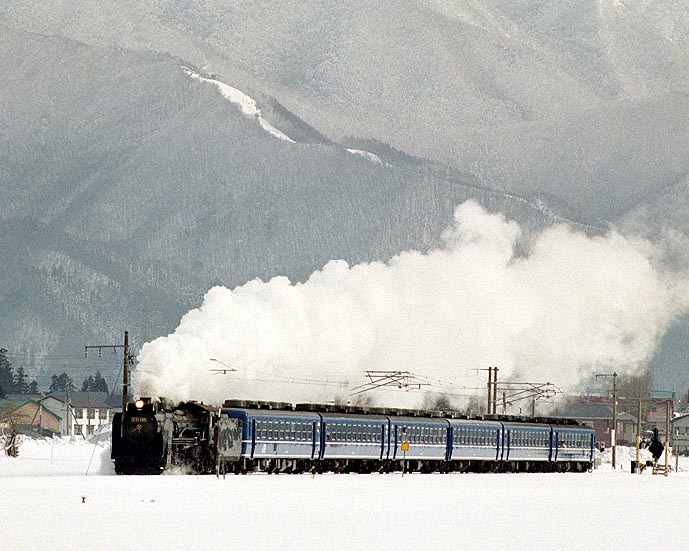 猪苗代を発車する磐梯会津路号。広々とした雪原と背景の山並みがすっきりとして人気のポイントだが 長玉(といっても300mm)で、思いっきり背景を山肌で埋め尽くしてみた。 (2002/02/02) 前へ 次へ RW目次へ