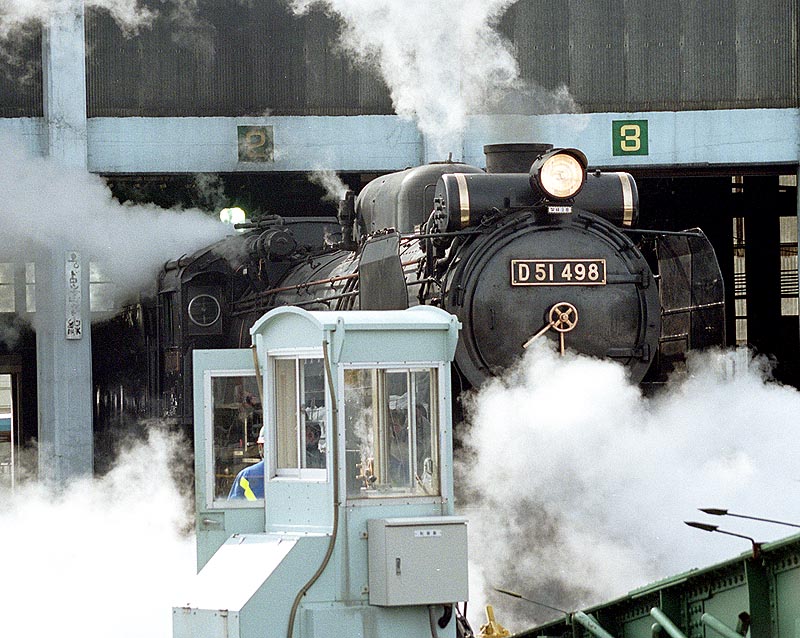 会津若松機関区に入庫するD51498.ドレーンや排気や安全弁や発電機から湯気を吹きまくっていたので ほぼ満足。残念なのは、転車台の操員があっちを向いて顔が見えなかったこと。 (2002/02/02) 前へ 次へ RW目次へ