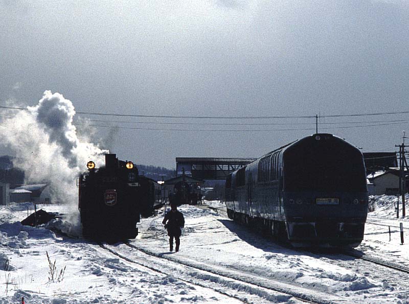 給水を終え、火床を均した後ちしばし佇むC11の隣に釧路行き快速「摩周」が入線した。 標茶駅 2001.02.20