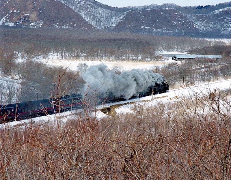 撮影アングルを通過してから猛然と煙を吹いて走り去る「釧路湿原号」 2001.02.20 見事に肩透しを喰わされ怒りに燃えながら岡を下ろうとしたとき、スリップ!! そしてカメラの上にモロに尻餅をついてしまった。 300mmズームレンズが根元からぽっきり折れ、ボディのマウントにも歪みが・・・・そして踏切付近から黒犬の子供とおぼしき茶色の 子犬にずっとエスコートされてしまった。(涙) 前へ 次へ 「今月」目次へ戻る