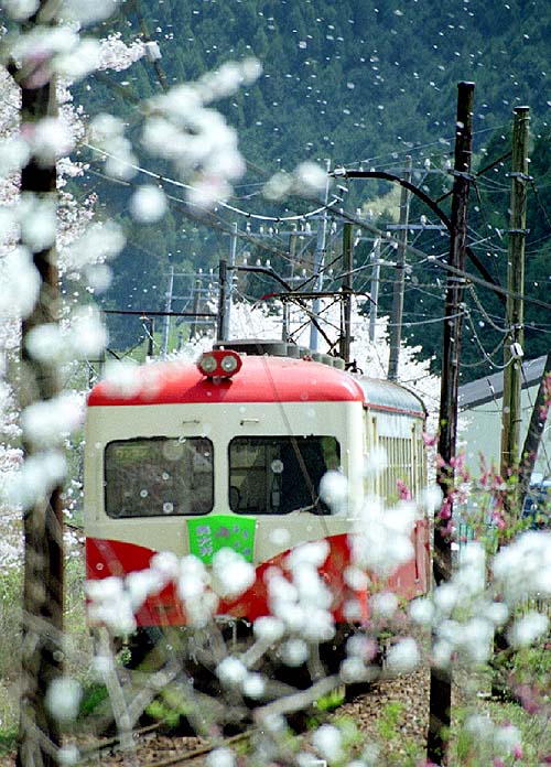 桜吹雪の中を走り去る2両編成。SLのときもこのような光景を