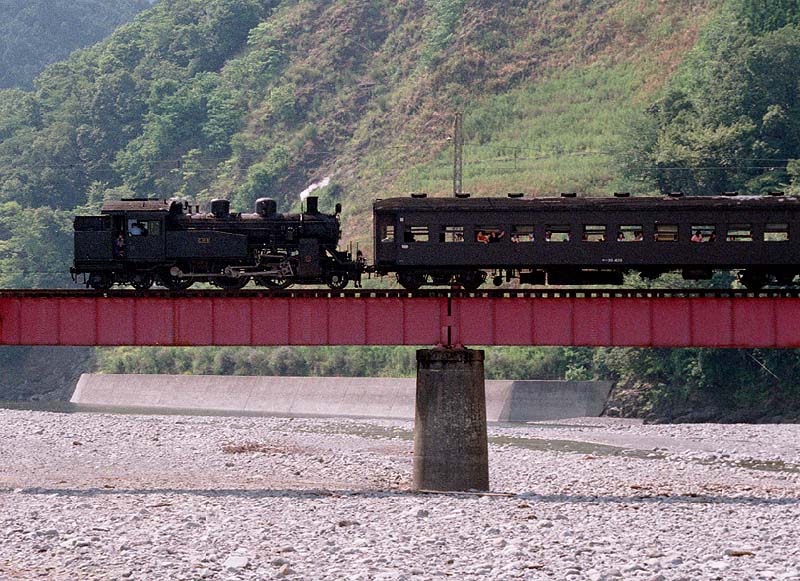 三重連の前日に102レを率いて金谷へと下るC10 8号機。千頭第4橋梁付近。(2001/7/14)