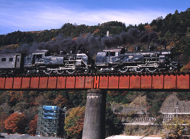 その2.本日の下りの本命101レ、C108とC11227の重連を第二橋梁で撮影。既に多くの三脚が茶畑 に乱立していたが、一人天邪鬼をおこして河原に下り、サイドギラリを狙った。 次へ 前へ 今月のRWの戻る