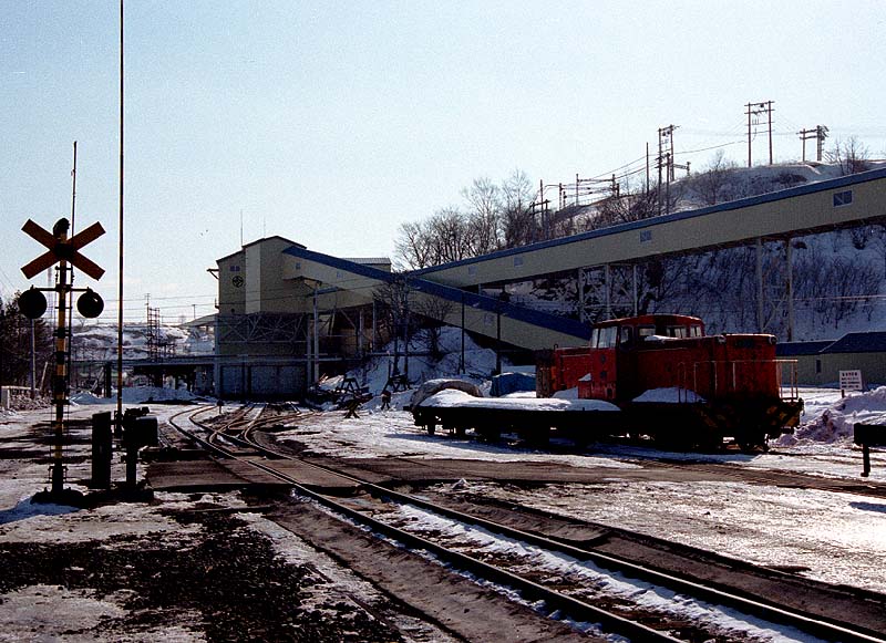 太平洋炭鉱鉄道の春採駅構内から石炭積みこみ施設を臨む。以前は積みこみホッパーと炭鉱の間を小さな電気機関車が 牽引する石炭列車で結んでいたが、現在はベルトコンベヤーに置換えられてしまった。(2001.02.20)