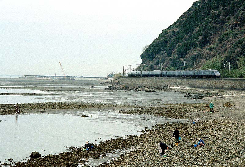 線路が国道から大きく離れます。名撮影地、八代湾の波打ち際を”特急つばめ”が走り抜けました。