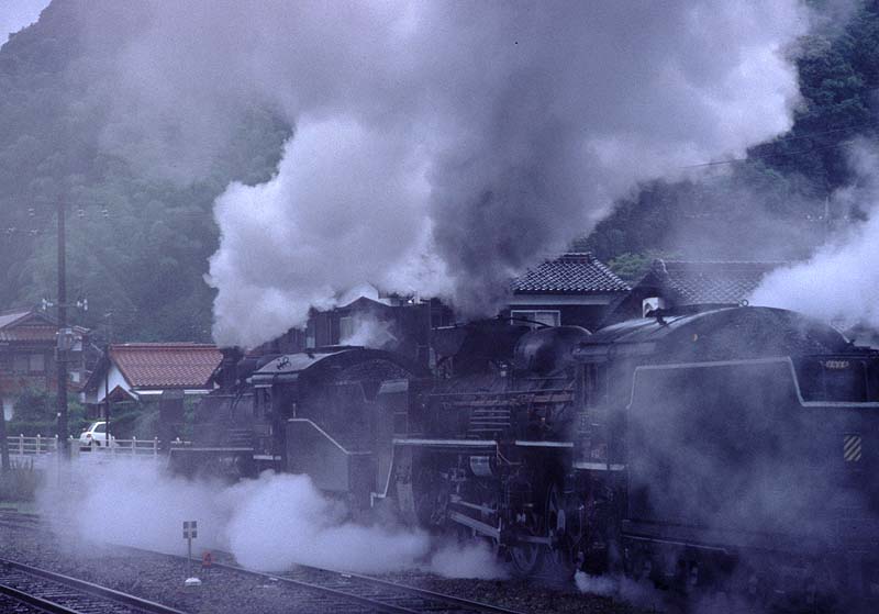 NG集の最後の一枚。津和野で準備の整ったC56+C57が入れ替え作業に向かうところを捉えた。 「山口号」発車に見える様にスナップしたのだが、一瞬遅く、C57のテンダー背面が写ってしまい客車を連結していないのが ばれてしまった。 次へ 前へ 目次へ戻る