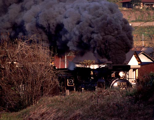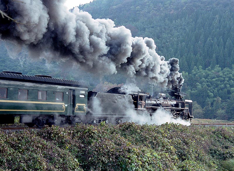 爆煙その4. 津和野を発車し、船平山の築堤を駆け上がる上り山口号 晩秋の陽はつるべ落し。谷間は早くも日が陰り、ひんやりした空気が 漂い始めていた。しかし、それこそが求める状況だった。淡い半逆光 によって陰影がはっきりとして、きっと煙の量感を表現できるだろう。 結果は狙いどおりだった!!順光側は案の定べったりとして発色 も悪いつまらない写真だった。 次へ 前へ 今月のRWへ戻る