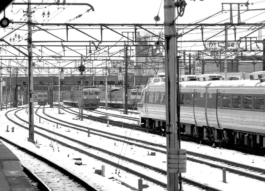 大雪でダイヤが乱れ、上野駅到着の順番を待つ列車で線路が埋め尽くされていた。