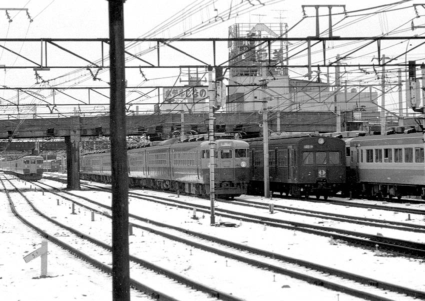 東北線の115系、信越線の165系、常磐線のゲタ電は上下とも、最外には常磐線急行のサロ451。 線路で立ち往生する電車、電車、電車。この千載一遇の光景は「鉄」の目には天下の一大事に映った。 この写真を撮り、そのまま読●新聞にスクープ!!とばかりに持ちこんだ。しかし写真を一瞥した記者は 丁重に掲載を断った。新しいフイルム2本と●売グッズを手に、若き「鉄」は満足して帰宅したのであった。 戻る 次へ